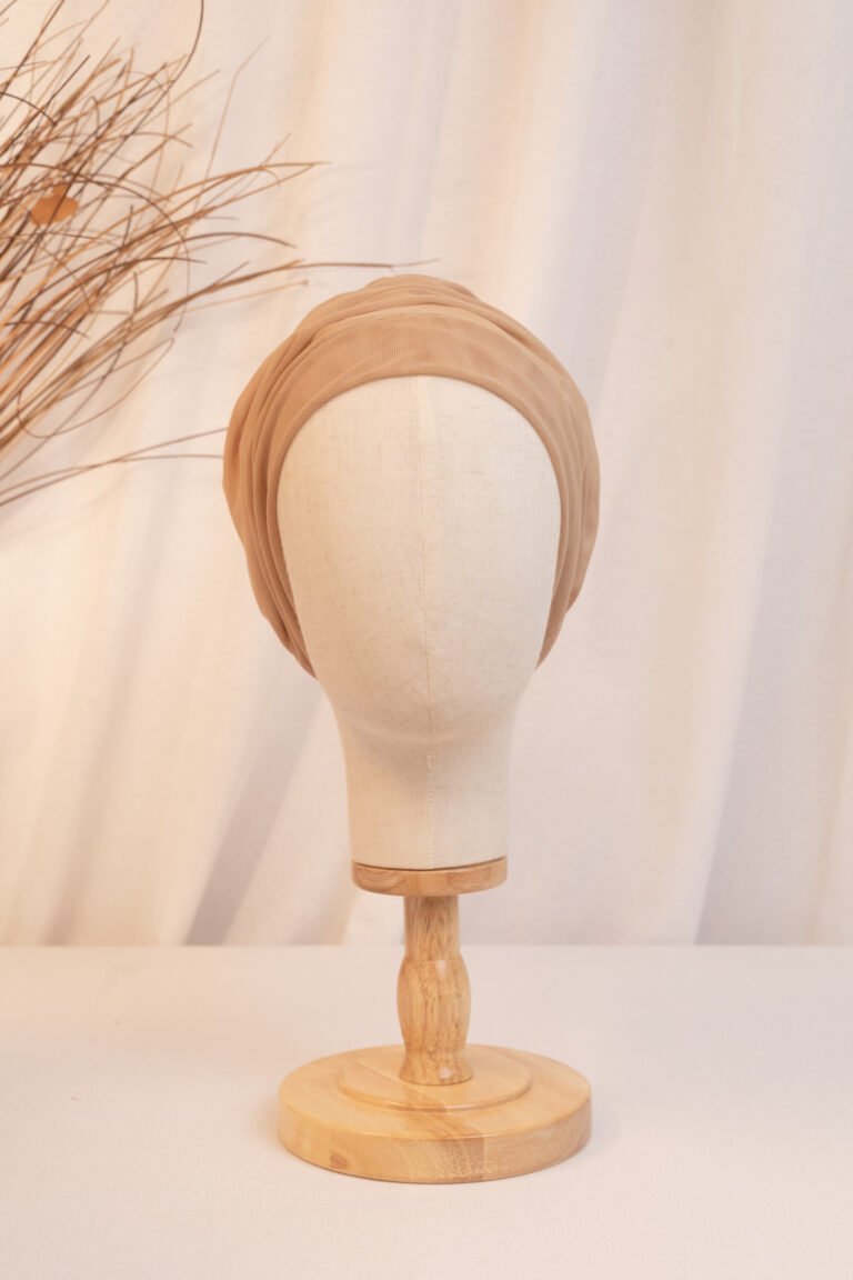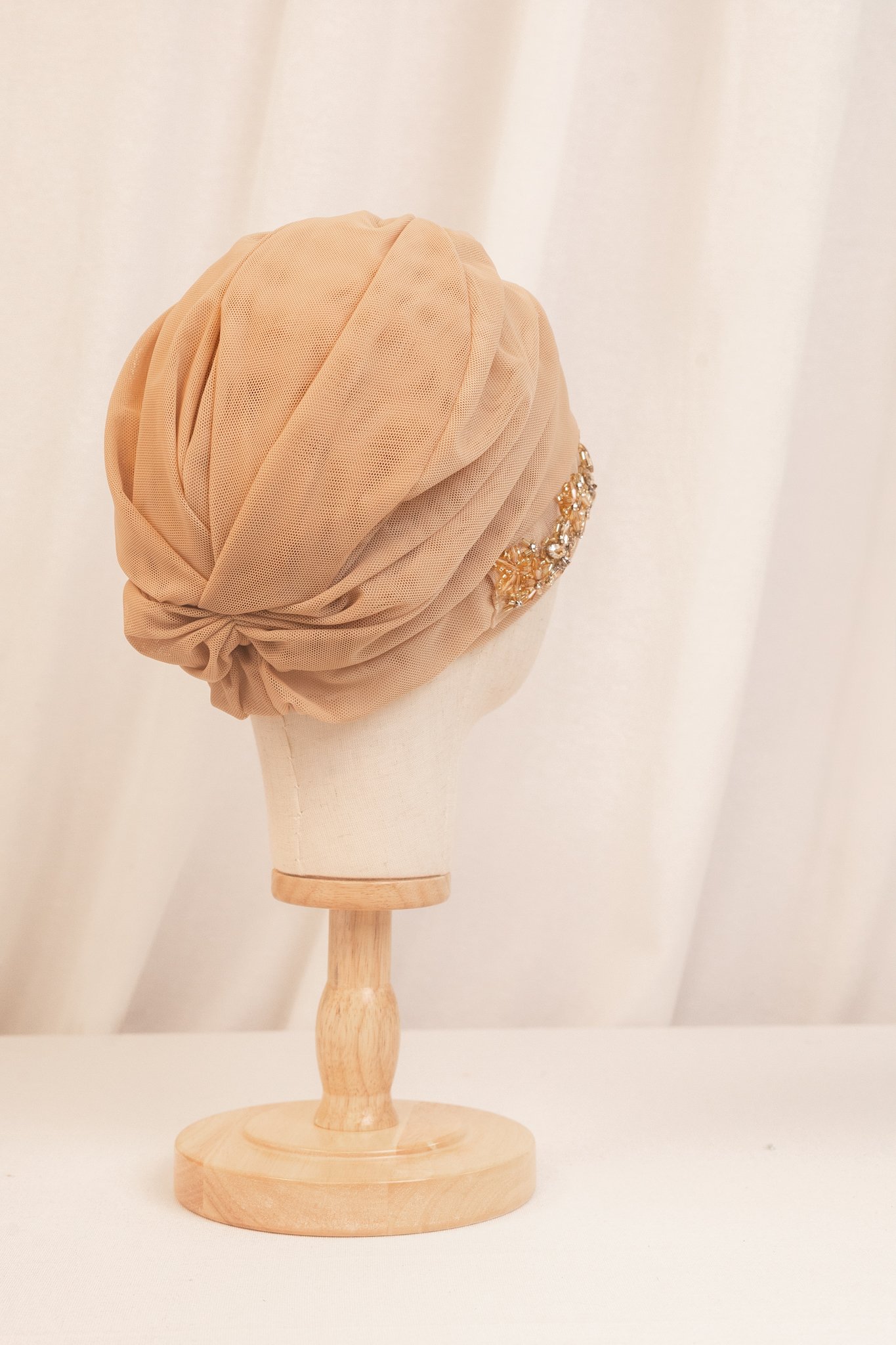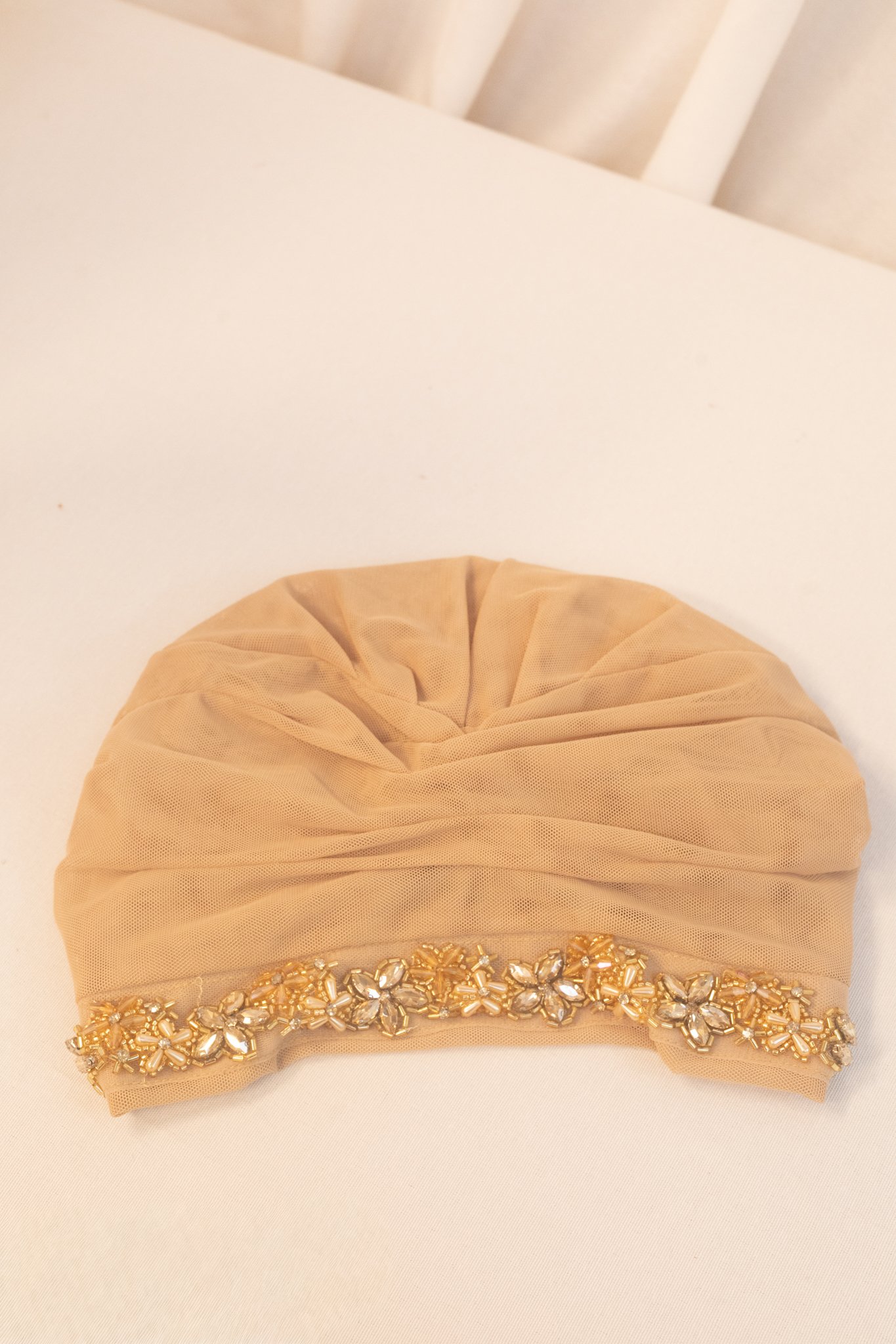 Elegant, refined, and timeless. The Golden Aura Turban features delicate crystal floral accents that add a touch of luxury without overpowering its soft golden-beige tone. Crafted from airy, breathable mesh, it drapes gracefully and feels weightless to wear — a perfect choice for special occasions or evenings that call for quiet sophistication.