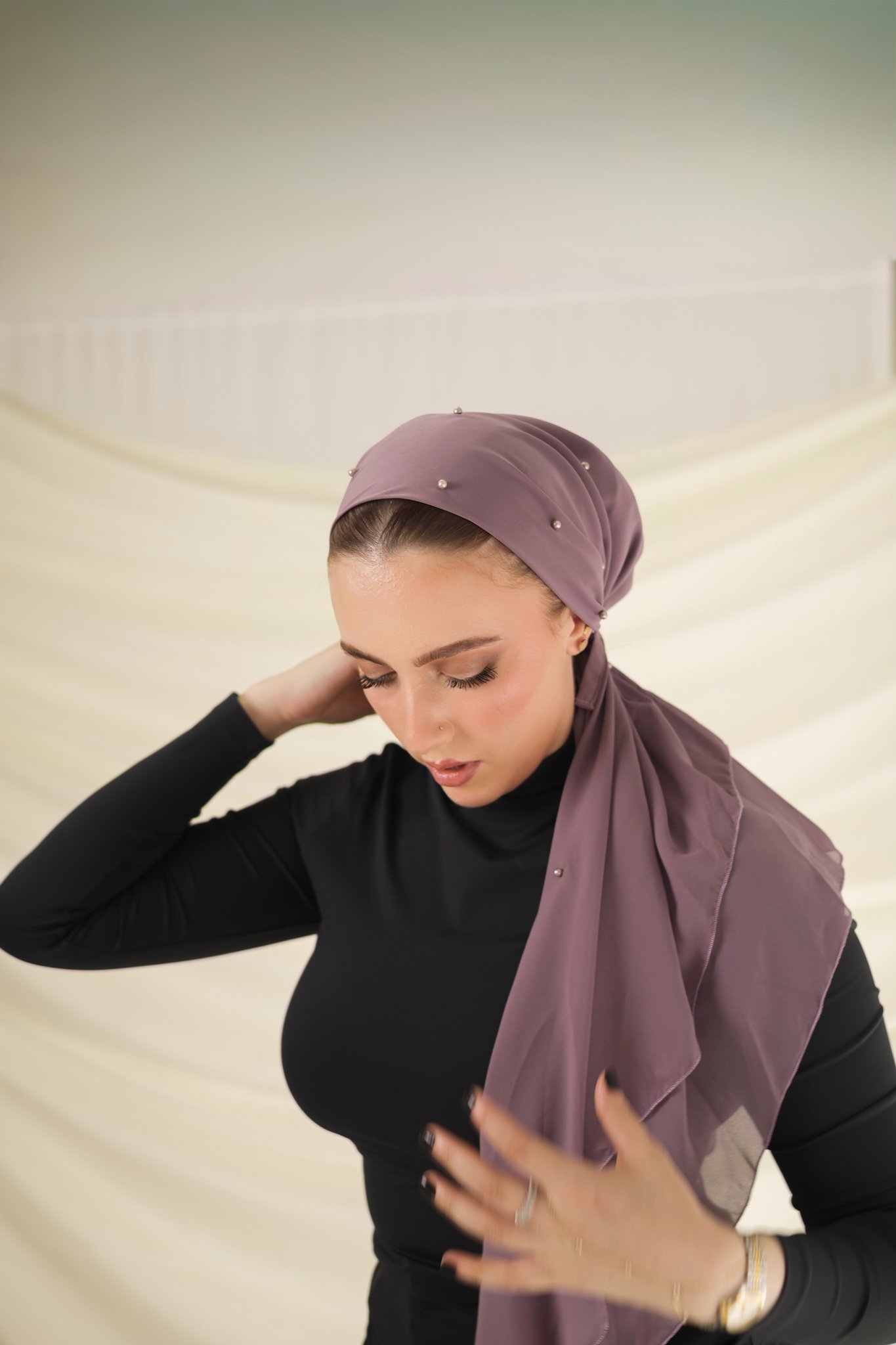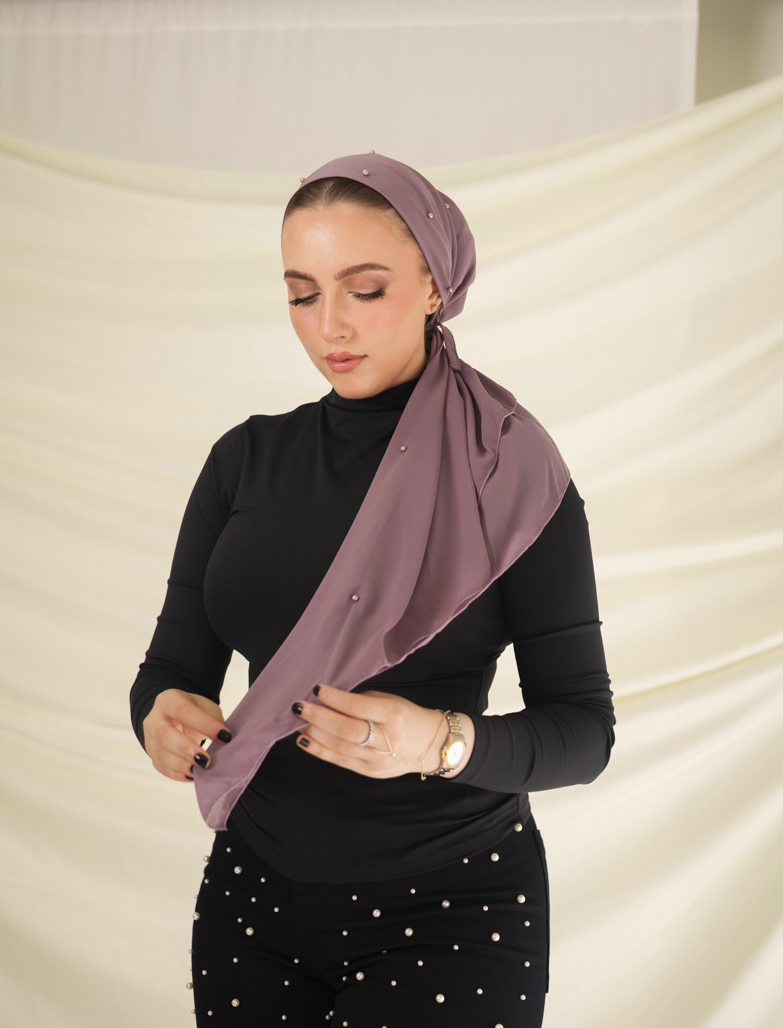 A muted purple tone with a romantic undertone, finished with subtle pearls for added depth. Feminine, calm, and refined — a modern statement in soft luxury.