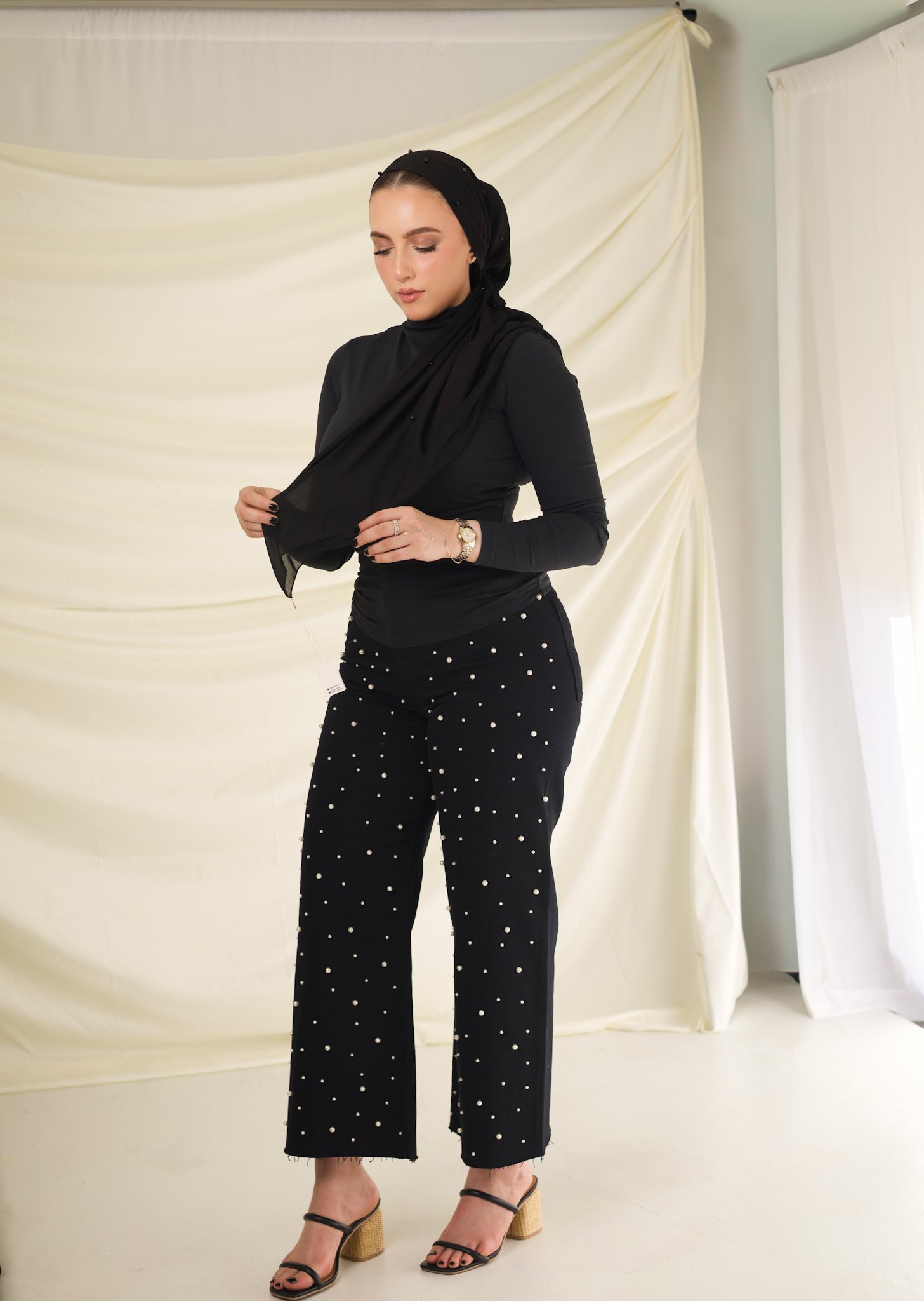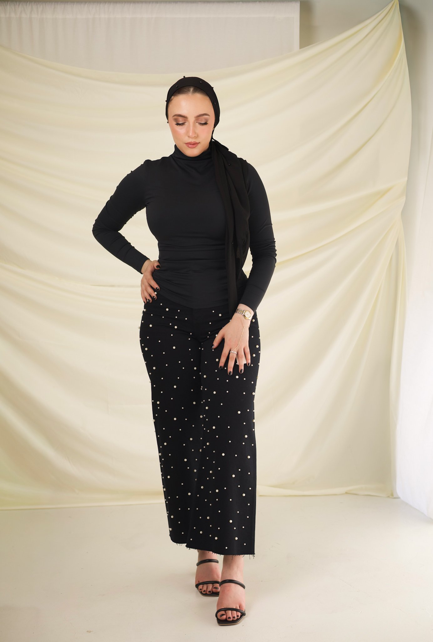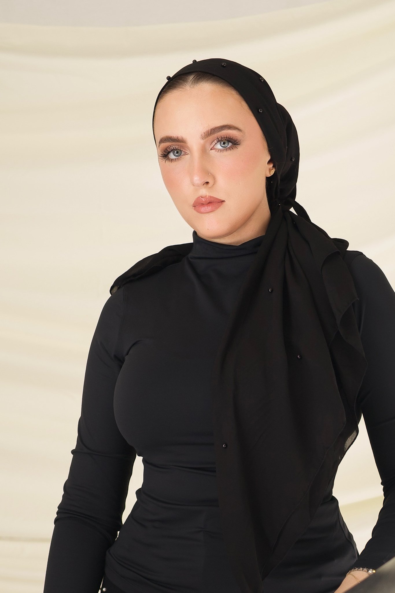 A classic black chiffon turban adorned with delicate pearl accents. Designed to elevate evening looks and refined daily wear, offering quiet confidence with timeless elegance.