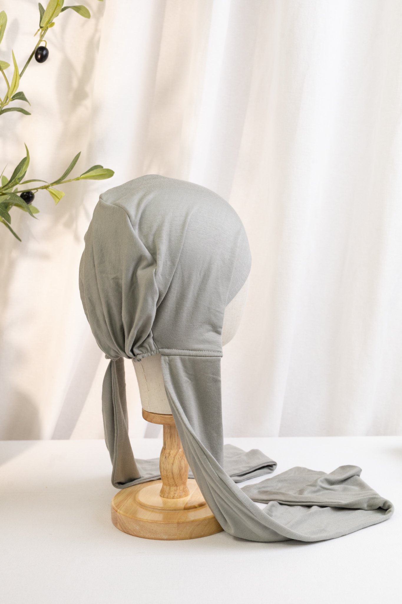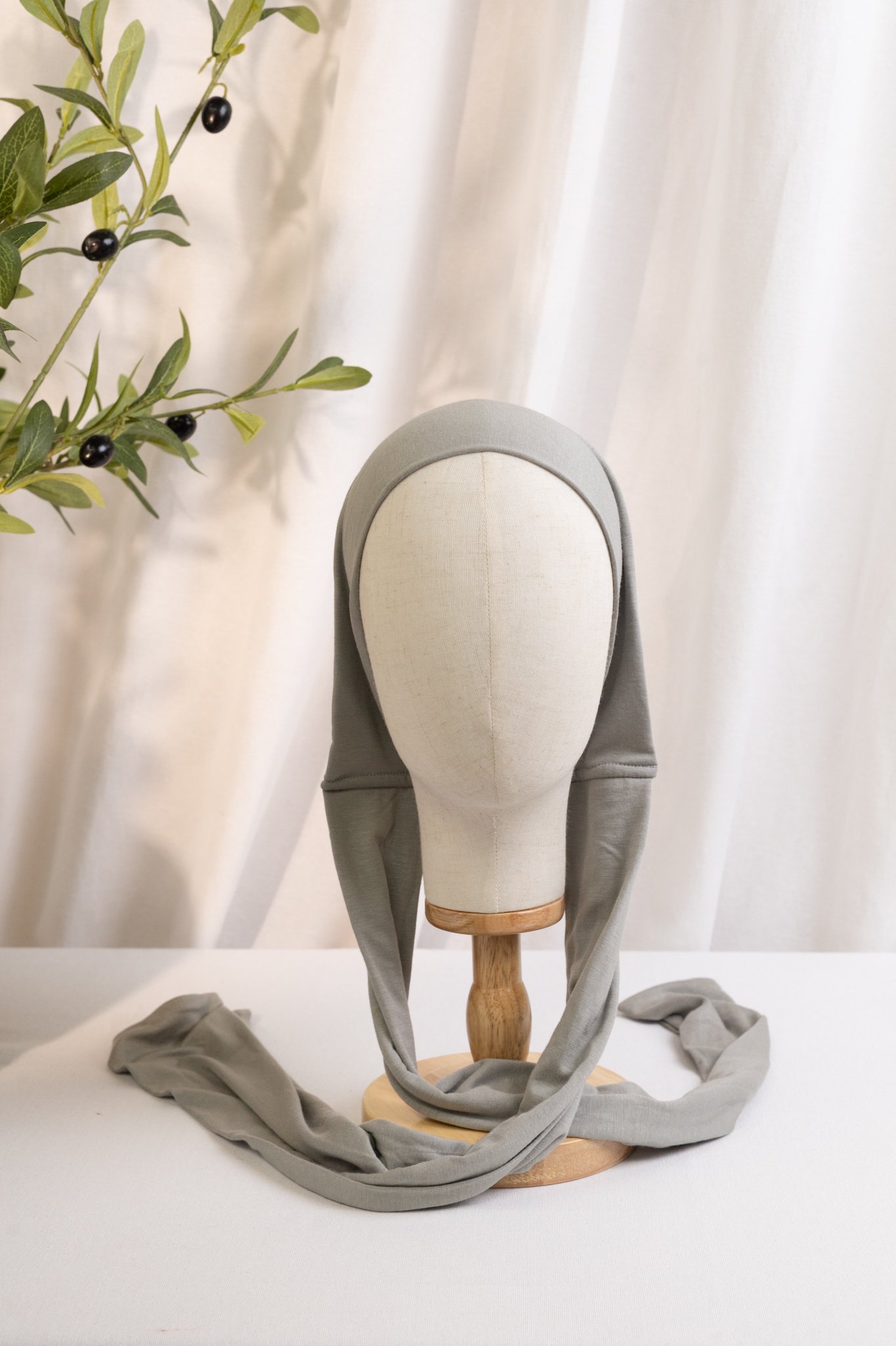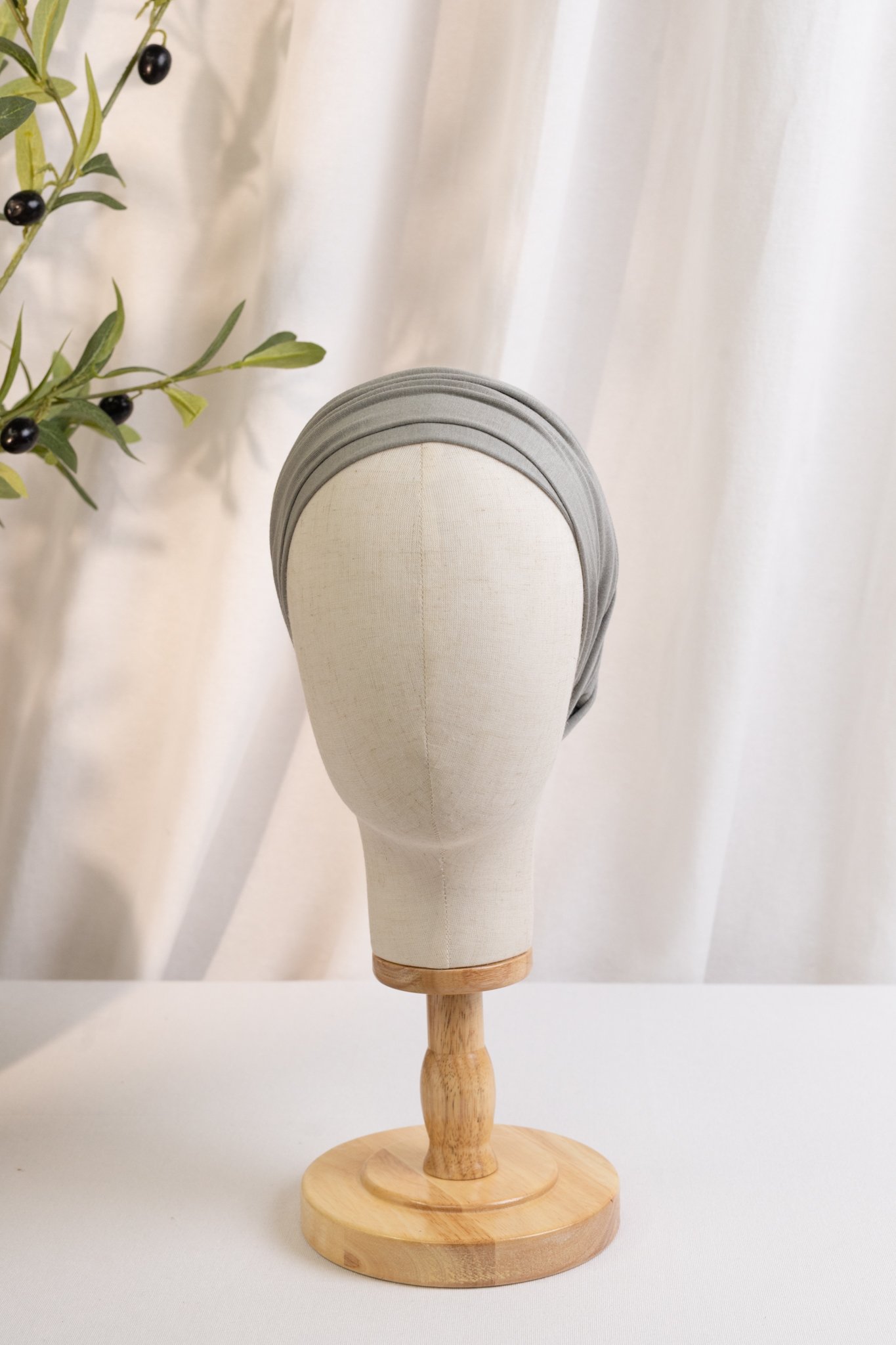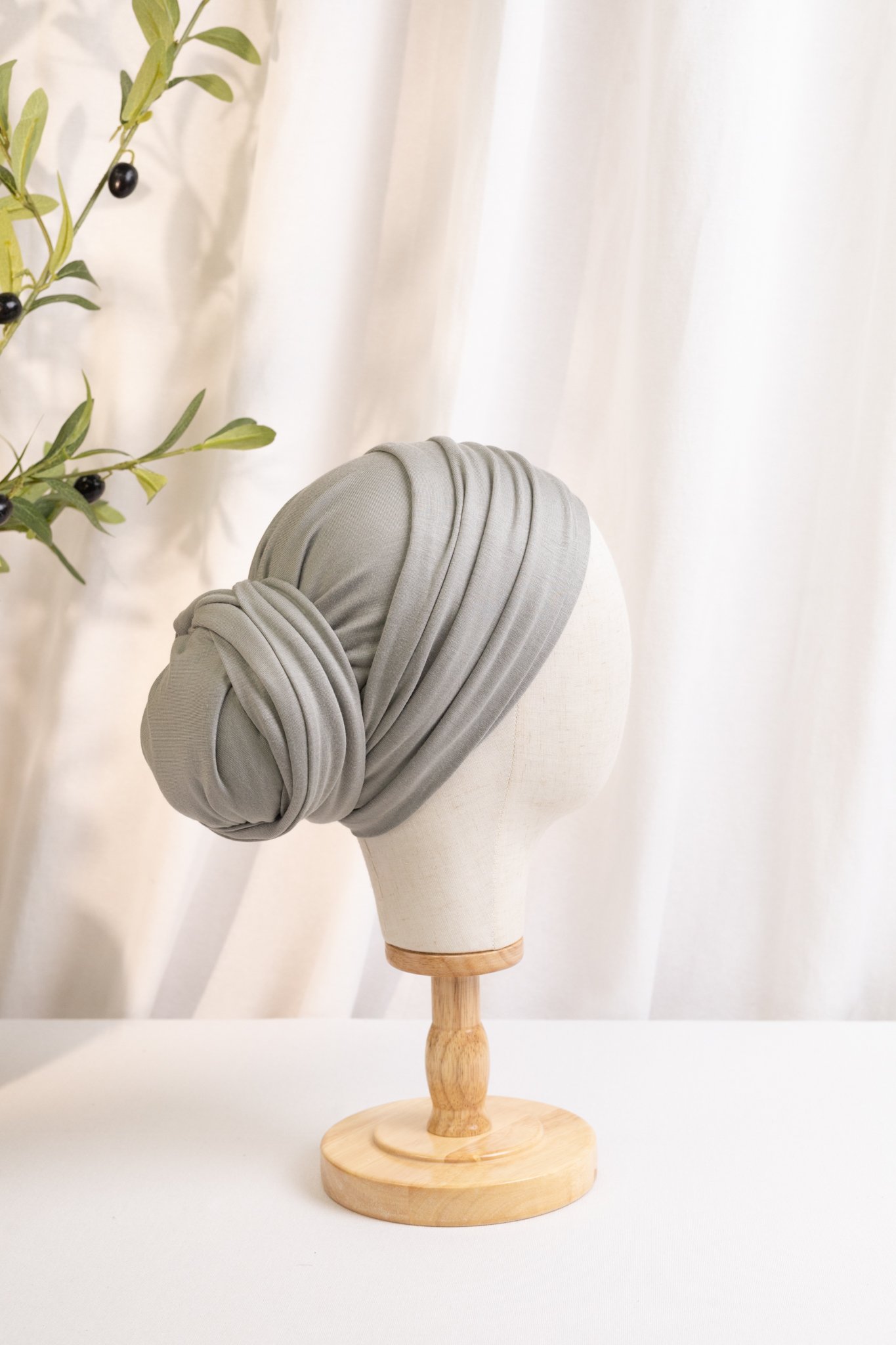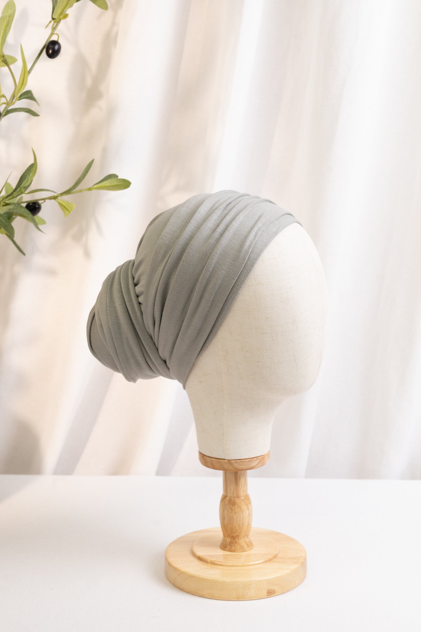 The Sage Mist Turban blends muted green-gray tones with a fluid, modern silhouette. Its flexible ties make it effortlessly adjustable, offering endless styling options for a look that feels both calming and contemporary.